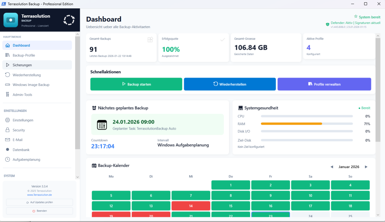 Terrasolution Backup sichert Dateien, Ordner und Datenbanken zuverlässig. Integrierte 7-Zip Engine für schnelle Komprimierung, VSS-Snapshots für offene Dateien, Backup-Explorer zum Durchsuchen von ZIP-Archiven ohne Entpacken. Features: Profilverwaltung, Scheduler, E-Mail-Benachrichtigung, GFS-Rotation, Security-Suite mit Defender-Integration. Unterstützt